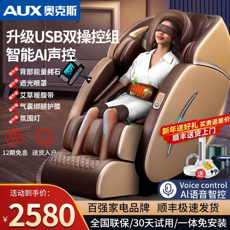 奥克斯(AUX)按摩椅家用全自动全身太空舱揉捏零重力颈部腰背部智能按摩椅父母长辈爸妈生日礼物 尊享米【新增加大机身+扶手联动+岫玉芯+3种操控】价格:2079.00元!