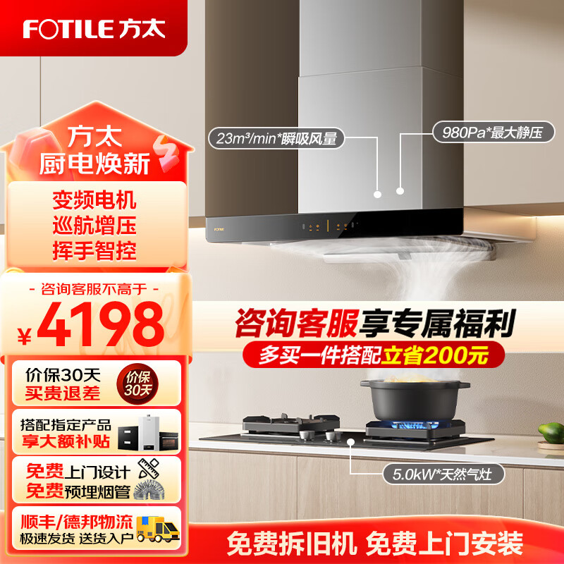 方太(FOTILE)油烟机灶具套装抽吸排油烟机23立方巡航风量变频电机5.0猛火灶换装可调节底盘EMD20T+TH29B价格:4198.00元!