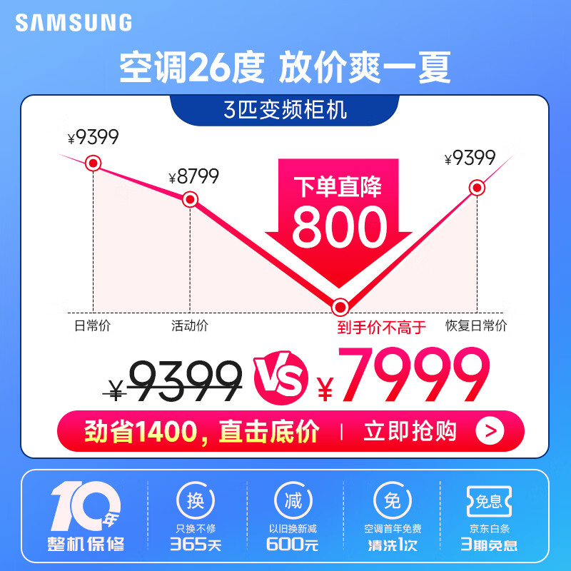 三星空调3匹新三级能效AI智能语音柜机立式全直流变频WIFI冷暖空调 38-50㎡适用以旧换新KFR-72L/EMG3价格:7999.00元!