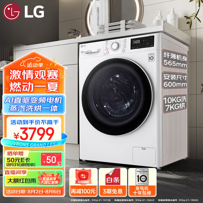 LG纤慧系列升级 10KG超薄洗烘一体机家用全自动洗衣机蒸汽除菌14分钟快洗超薄机身白色 FCY10R4W价格:3799.00元!