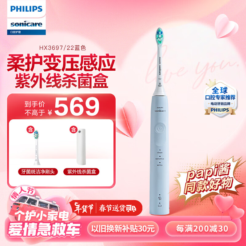 飞利浦(PHILIPS)【papi酱自用好物】电动牙刷成人健康护龈系列3种模式7倍清除牙菌斑蓝色HX3697/22新年 情人节礼物价格:649.00元!