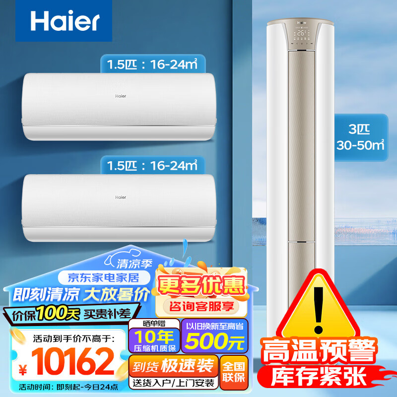 海尔(Haier)空调套装两室一厅新一级能效变频空调家用APP智控自清洁(1.5匹挂机*2+3匹立式柜机) 以旧换新价格:10162.00元!