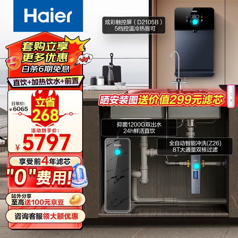 海尔(Haier)净水器1200G鲜活水双出水 pro家用净水机厨下直饮+前置过滤+管线机HKC3000-R880D2U1+D2105B+Z26价格:5797.00元!