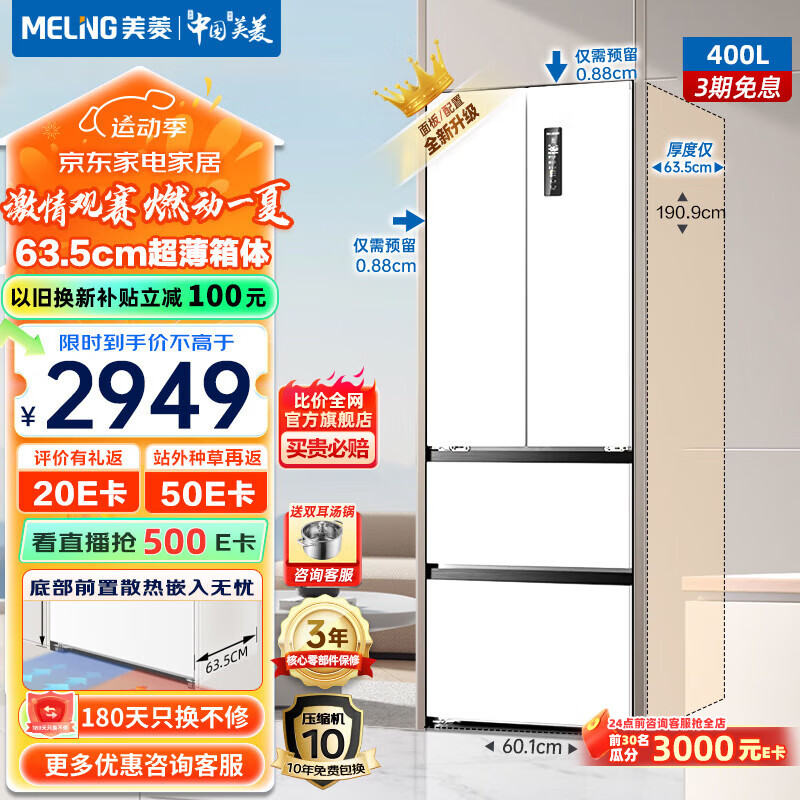 美菱(MeiLing)冰箱400升法式双开门冰箱对开门家用一级能效零嵌入式超薄601mm窄箱体风冷无霜底部散热四门电冰箱 【新款Pro版】BCD-400WPU9CZX-白价格:3149.00元!