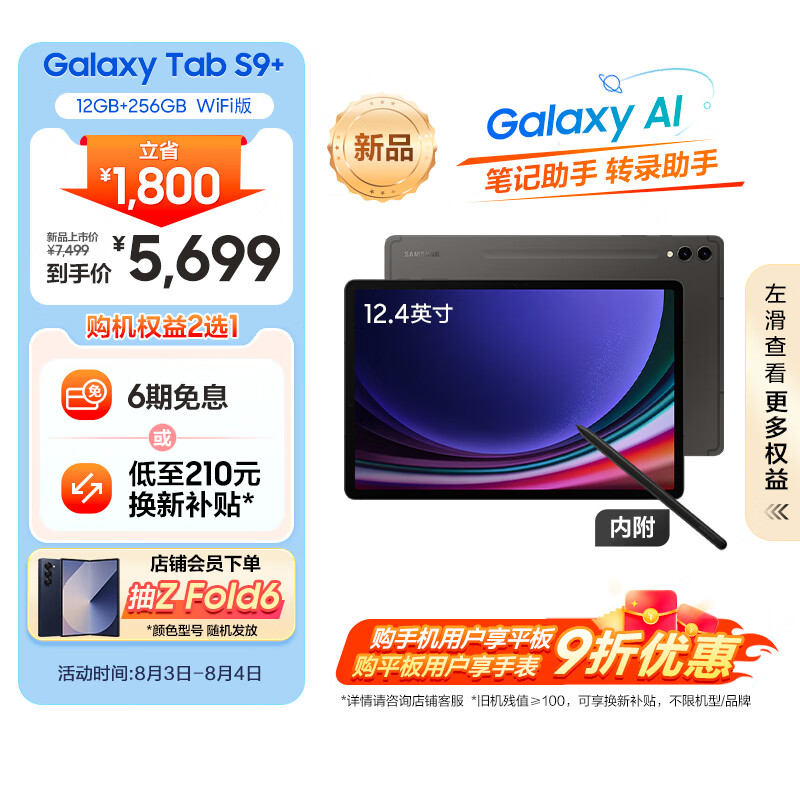 三星(SAMSUNG)S9+ Al智享学习办公平板电脑12.4英寸骁龙8Gen2 120Hz 12G+256GB WIFI版 AI平板 云影灰价格:5699.00元!