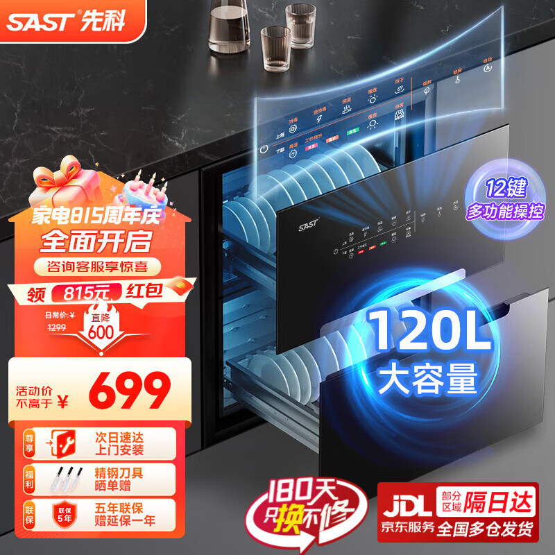 先科(SAST)消毒碗柜嵌入式家用厨房小型保洁柜三层双层大容量婴儿奶瓶餐具碗筷 120L /12键两层/高温消毒价格:1299.00元!