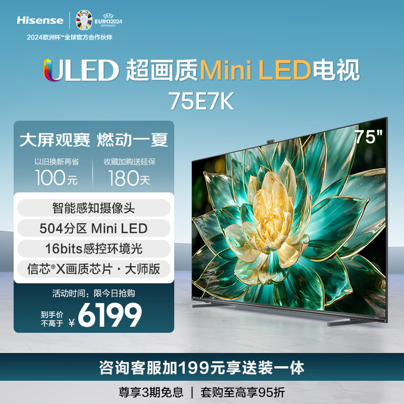海信电视75E7K 75英寸 ULED X Mini LED 504分区 AI摄像头超感知 智慧屏 液晶智能平板电视机价格:6199.00元!