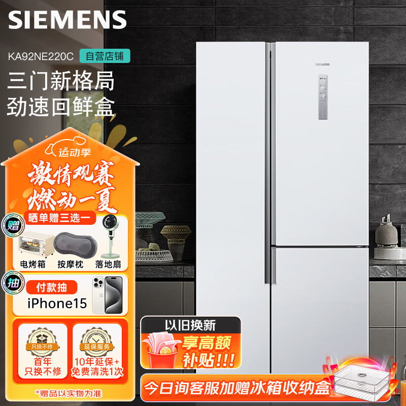 西门子冰箱三门509升风冷无霜55cm超薄机身底部散热IZA除菌净味保鲜T型大容量冰箱KA92NE220C价格:5349.00元!