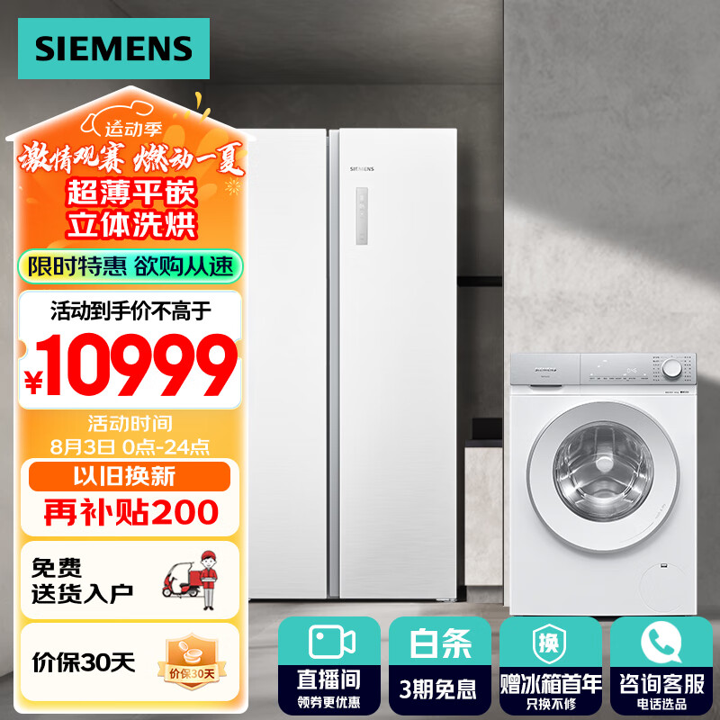 西门子(SIEMENS)冰洗套装512L超薄平嵌对开门冰箱+10KG洗烘一体KA512091EC+WN52B2U08W价格:10999.00元!