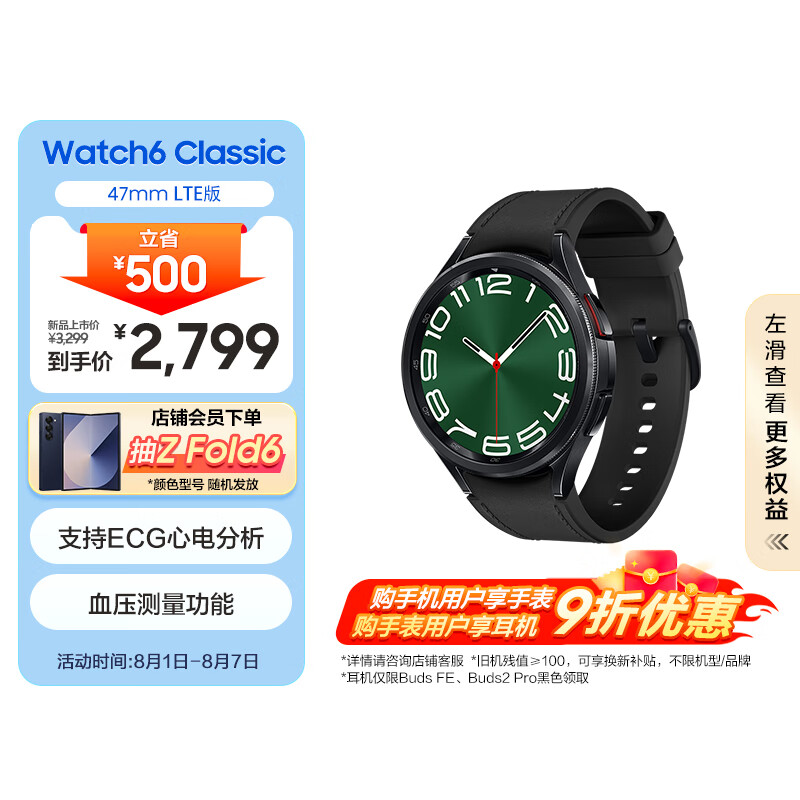三星[七夕送礼]Galaxy Watch6 Classic eSIM独立通话/智能手表/运动电话手表 47mm 宇夜黑 男女表价格:2799.00元!