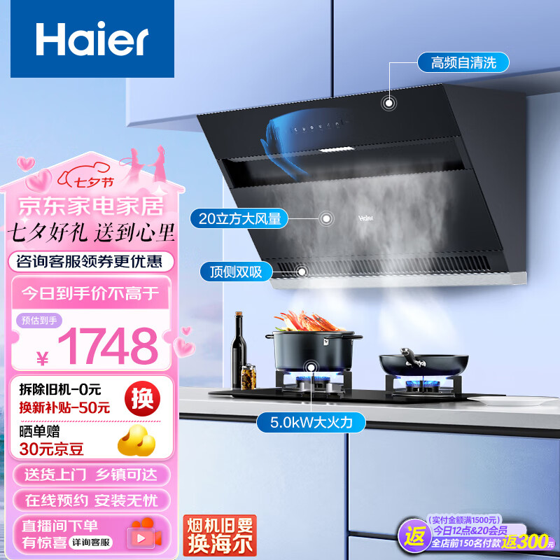 海尔(Haier)抽油烟机 顶侧双吸厨房烟灶套装 20m3/min大吸力 家用侧吸式油烟机灶具套装C6JS+Q2BE2天价格:1748.00元!