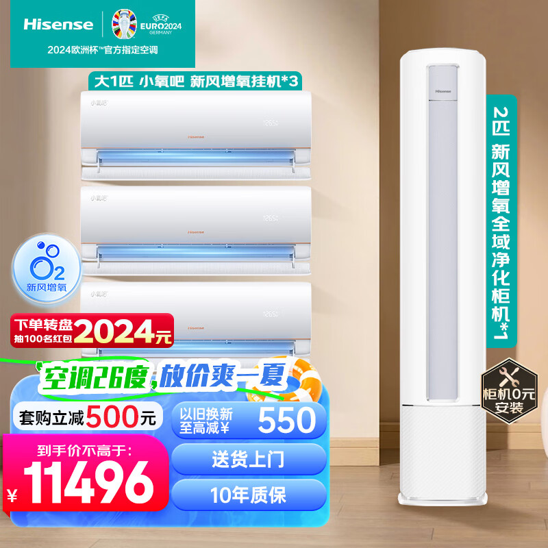 海信(Hisense)新风增氧空调套装 三室一厅 全域净化紊流柔风一级能效客厅柜机卧室家用挂机(大1匹*3+2匹)价格:11496.00元!