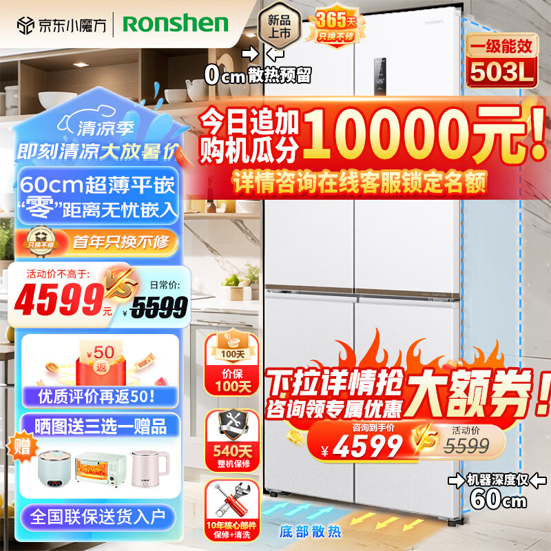 容声(Ronshen)【60cm平嵌系列】503升十字对开四开门超薄可嵌入式冰箱家用变频一级能效大容量BCD-503WD1FPQ价格:5599.00元!