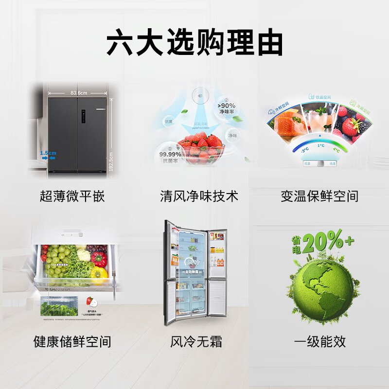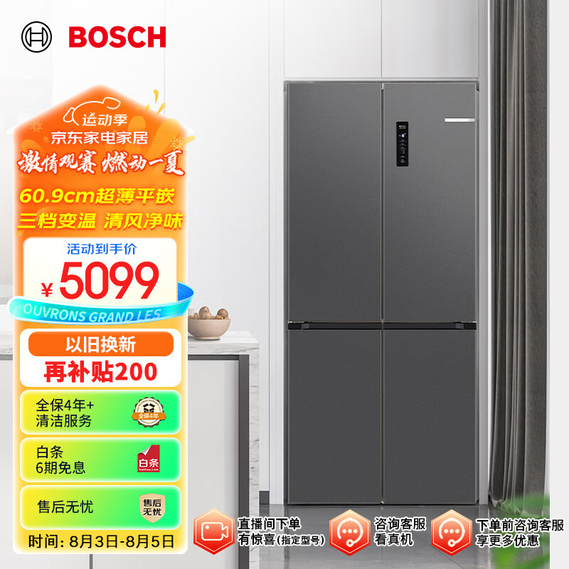 博世(BOSCH)【冰立方】497升十字对开四门超薄微平嵌入式冰箱60.9cm净味变温一级能效灰阶K1EC49788C超大容量价格:5299.00元!