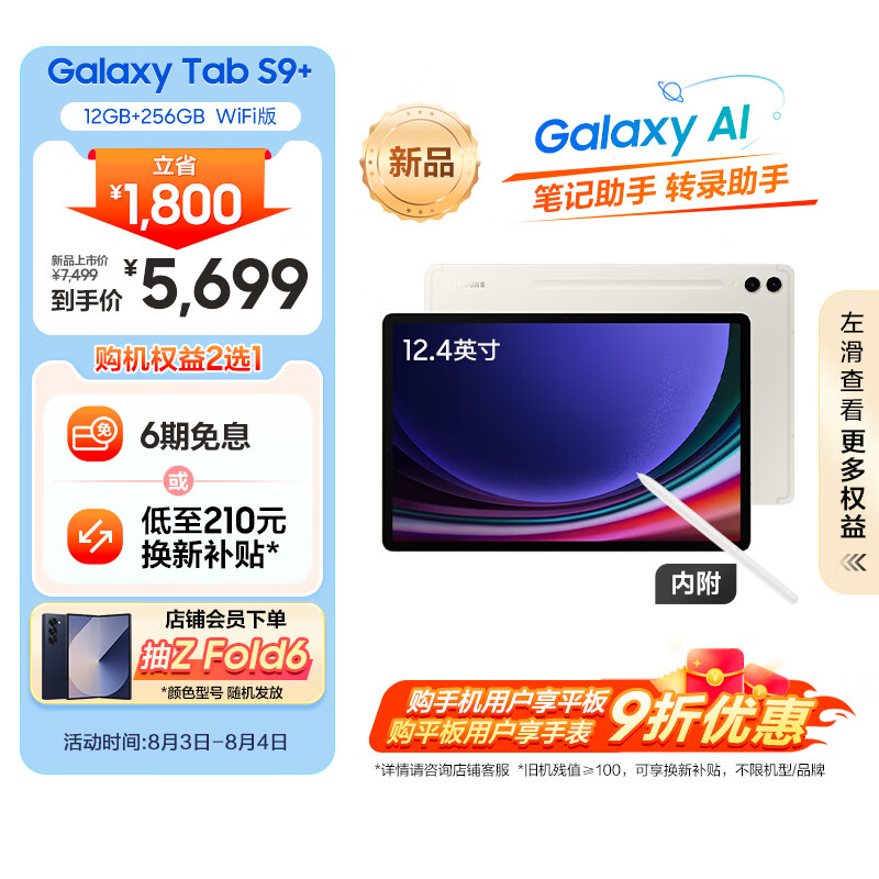 三星(SAMSUNG)S9+ Al智享学习办公平板电脑12.4英寸骁龙8Gen2 120Hz 12G+256GB WIFI版 AI平板 云雾金价格:5699.00元!