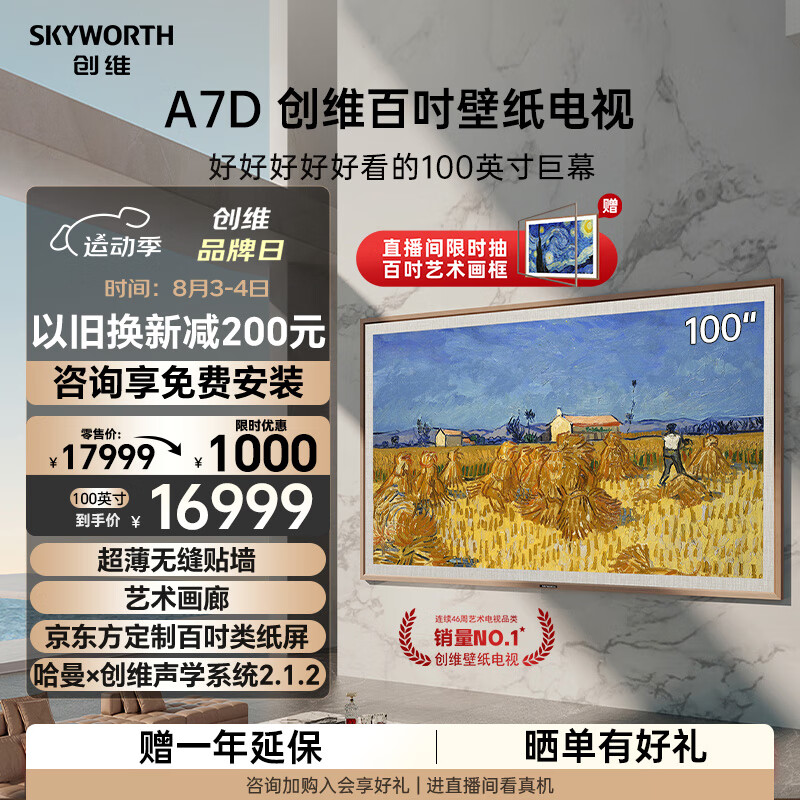 创维壁纸电视100A7D 100英寸超薄壁画艺术电视机 无缝贴墙 类纸屏不反光 巨幕大屏价格:16999.00元!