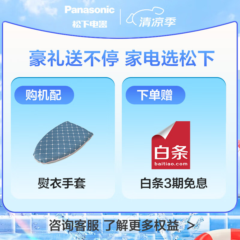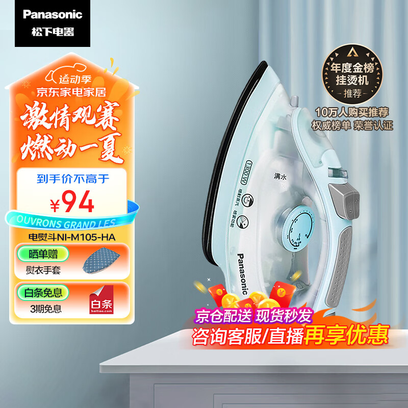 松下(Panasonic)电熨斗家用 手持蒸汽挂烫机 1300W 多档蒸汽 NI-M105N_HA 慧蓝色价格:94.00元!