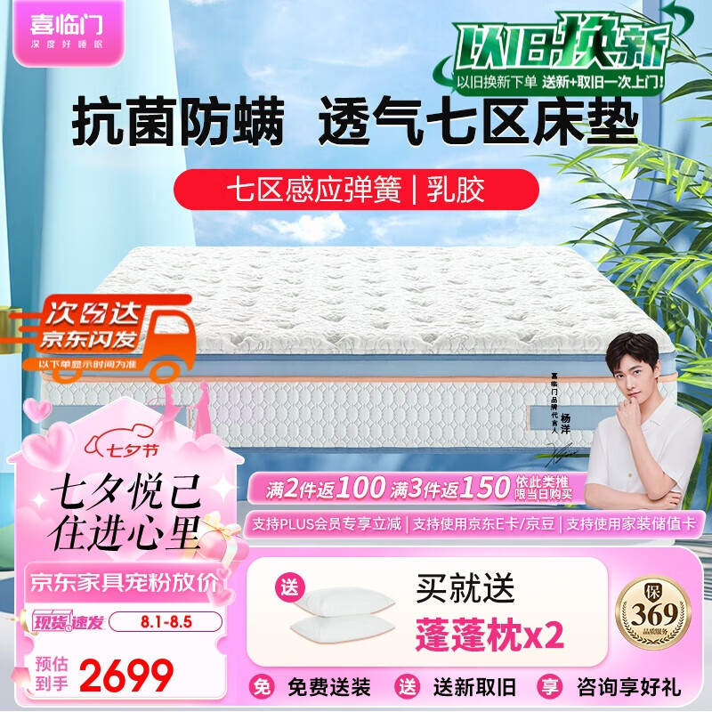喜临门进口高纯乳胶七区独袋弹簧床垫 黄麻床垫 软硬两用床垫 漾1.8x2米价格:2699.00元!