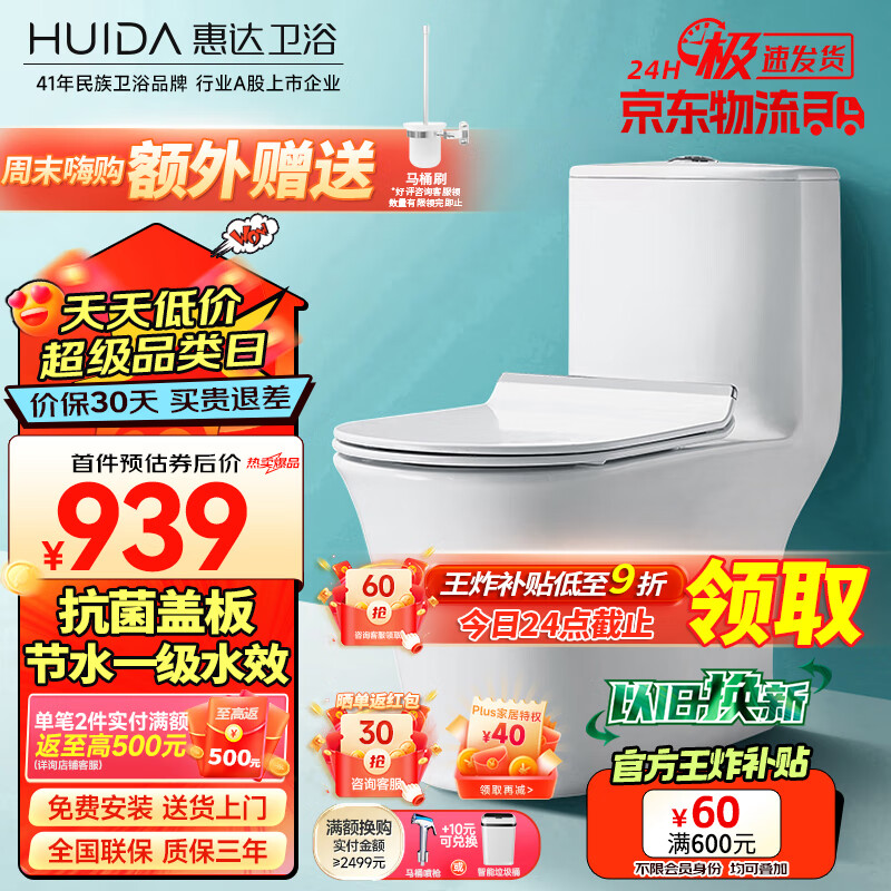 惠达(HUIDA)抽水马桶家用大冲力节水虹吸式卫生间坐便器HDC6218A 305坑距价格:1089.00元!
