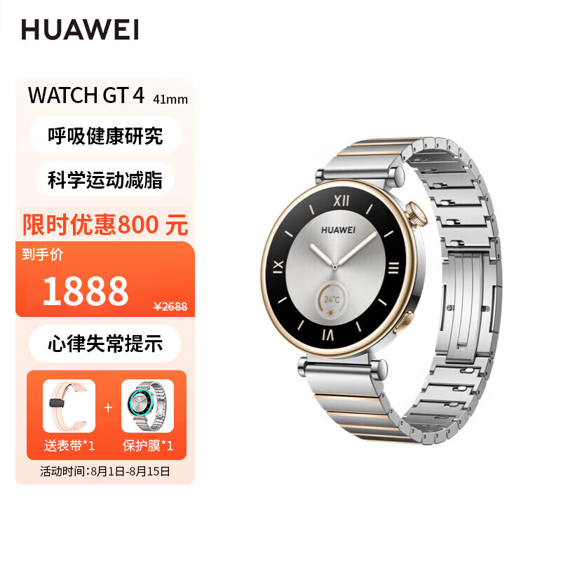 华为WATCH GT4华为手表智能手表呼吸健康研究心律失常提示华为gt4手表皓月银支持龙年表盘价格:1888.00元!