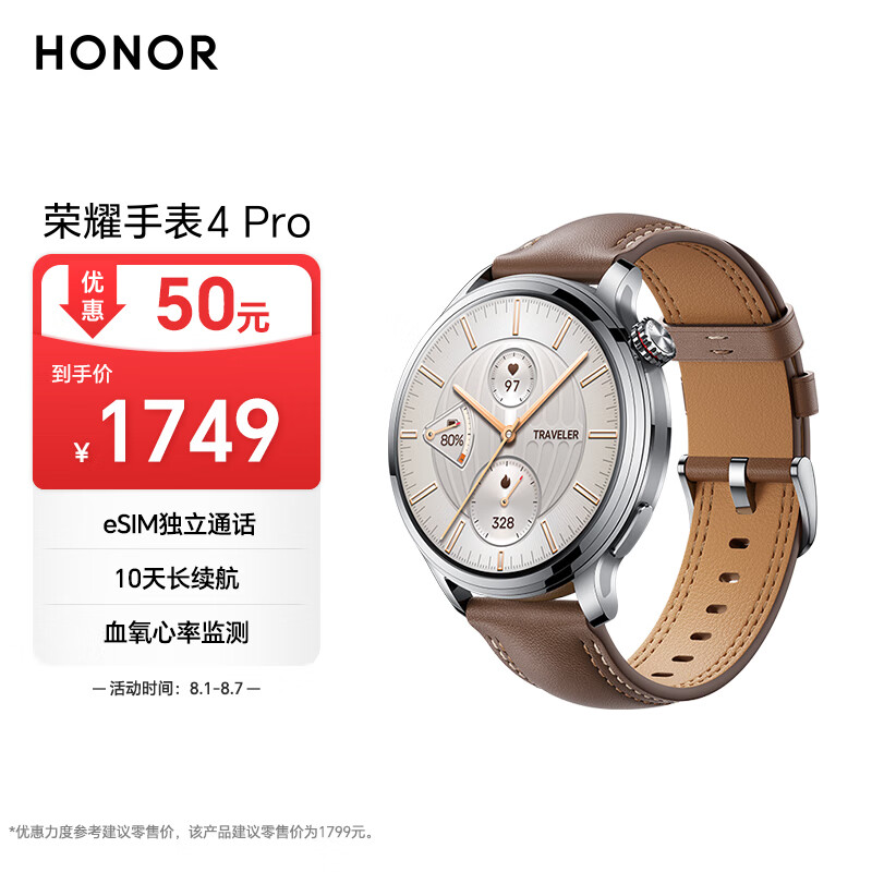 荣耀手表4Pro 棕色 双缝线真皮表带 超窄边常亮屏10天eSIM续航 智能手表 旅行使者 送男友价格:1749.00元!