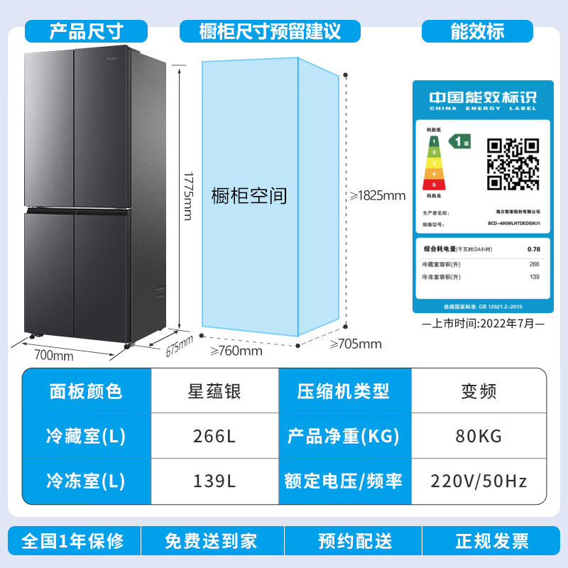 海尔BCD-405WLHTDEDS9U1配置参数: