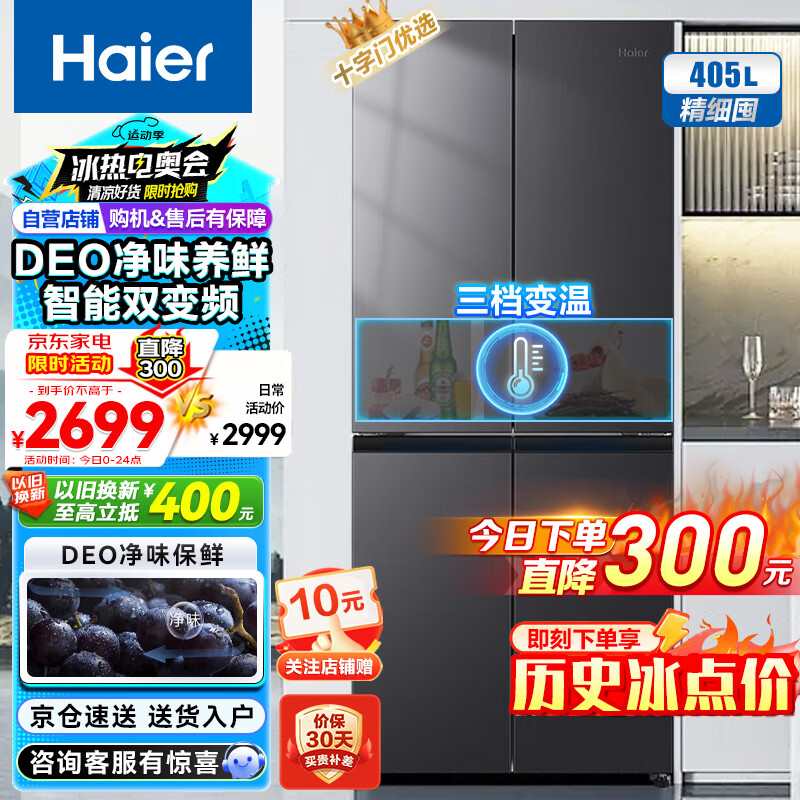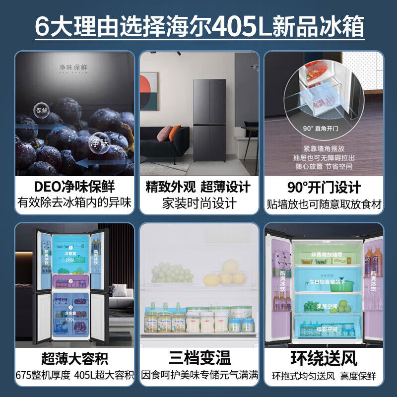 海尔(Haier)冰箱四开门 一级能效双变频节能 家用风冷无霜 405升大容量超薄 十字对开门多门精储电冰箱价格:2799.00元!