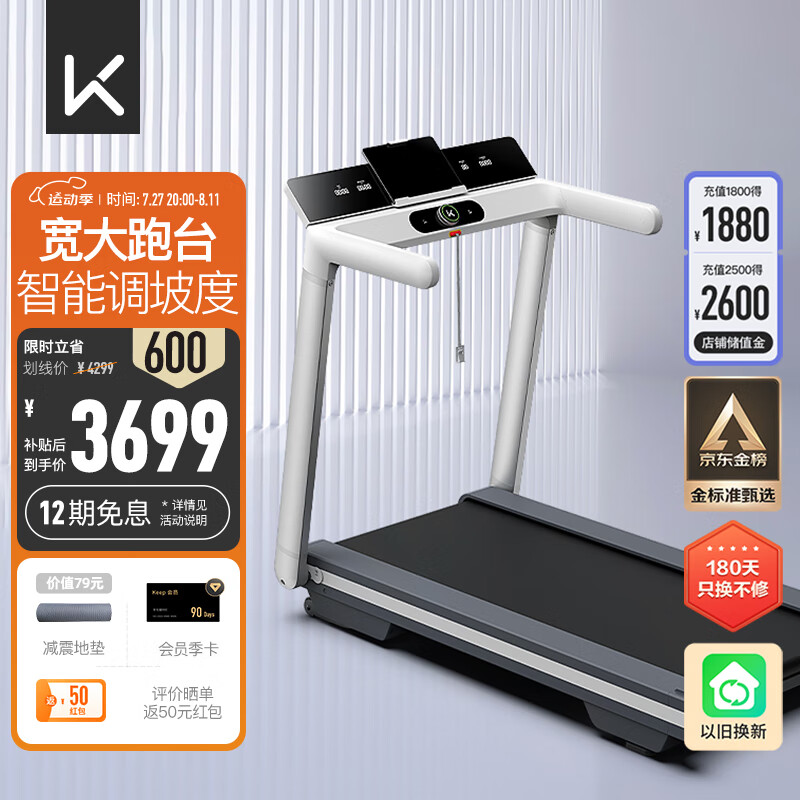Keep跑步机家用健身器材 智能坡度调 宽大跑台走步机 家庭锻炼K4白价格:3699.00元!