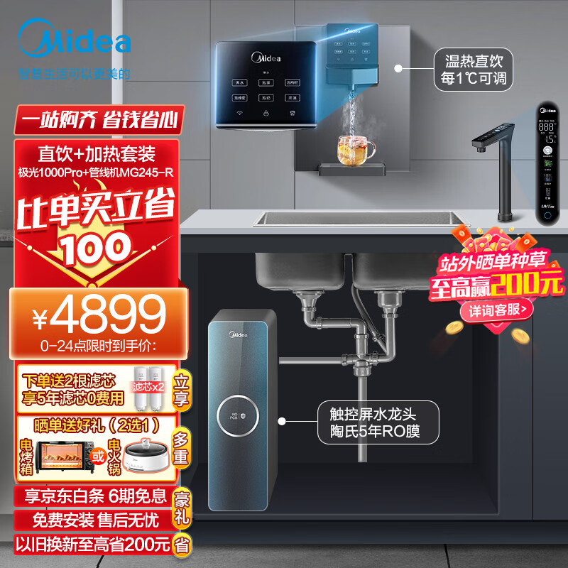 美的(Midea)直饮加热净水器套装【极光1000G pro+管线机MG245-R】厨下RO反渗透 家用壁挂式即热一体净饮机价格:4899.00元!