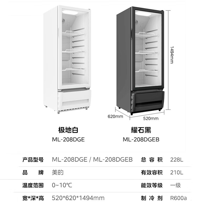 美的展示柜冷藏保鲜柜 210升立式单门饮料柜 便利店冰柜保鲜柜蛋糕柜鲜花柜商用冰箱一级能效ML-208DGE价格:1059.00元!