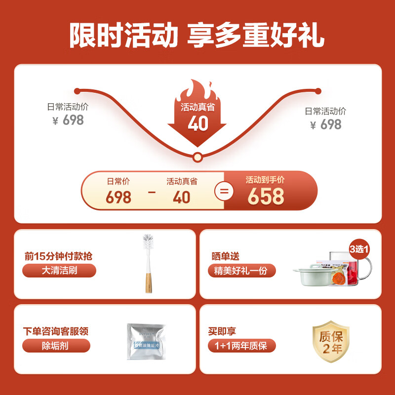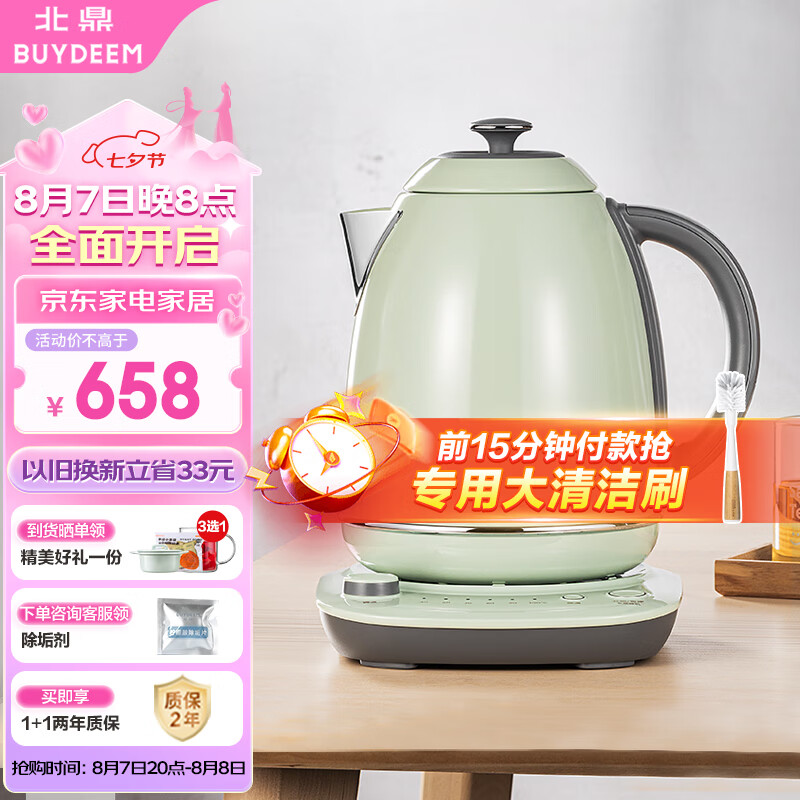 北鼎 Buydeem 炫彩304不锈钢调温热电水壶 K740C浅杉绿价格:658.00元!