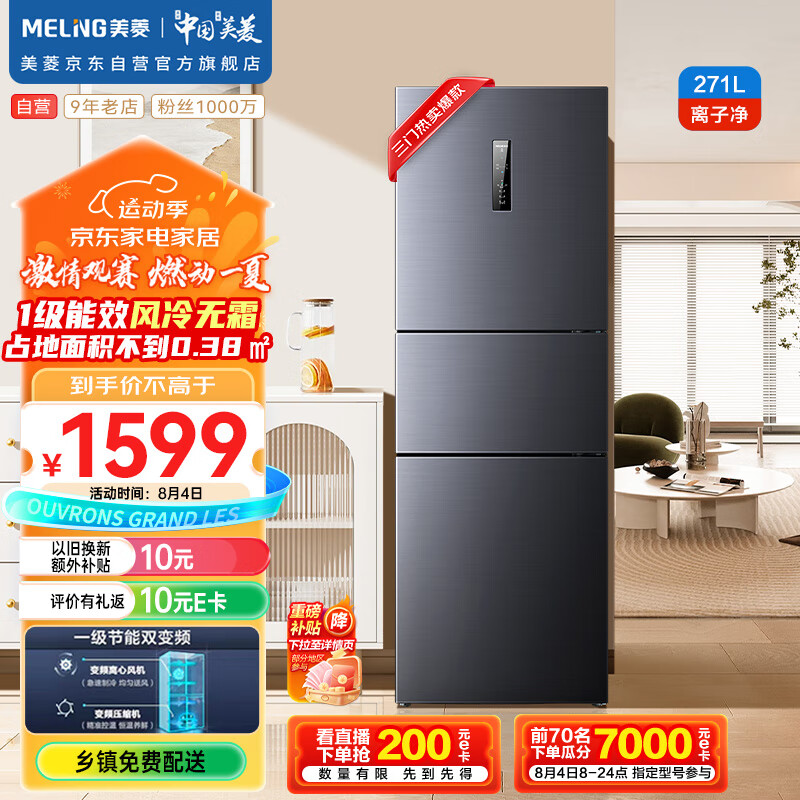 美菱(MeiLing)271升三门三开门冰箱家用变频一级能效节能省电风冷无霜低噪租房小冰箱BCD-271WP3CX以旧换新灰价格:1599.00元!