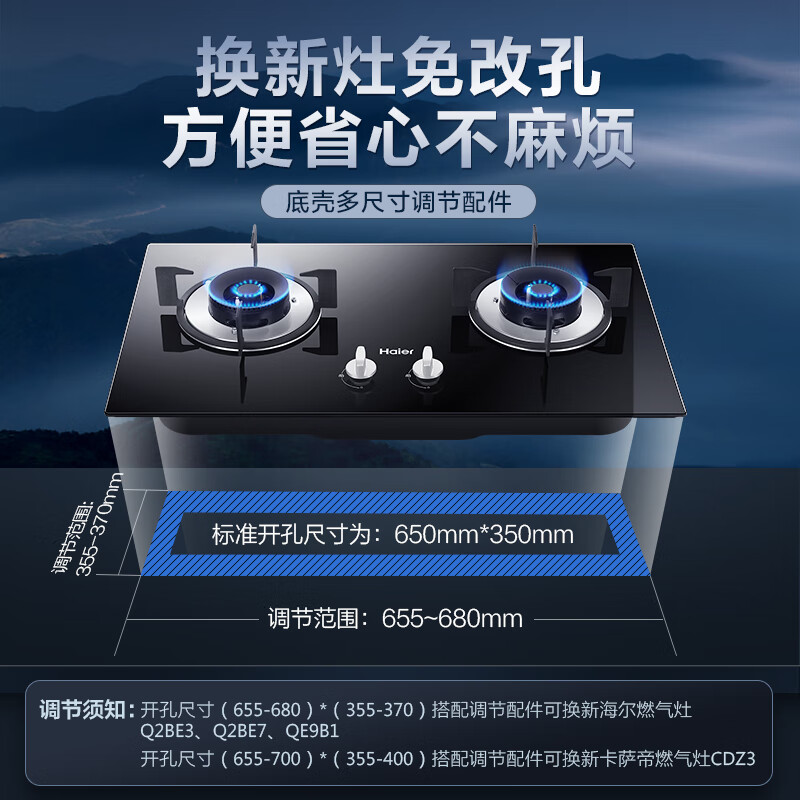 海尔(Haier)燃气灶 5.0kW大火力嵌入式瞬燃点火家用全进风钢化玻璃双眼煤气灶双灶 燃气灶天然气 Q2BE2价格:649.00元!