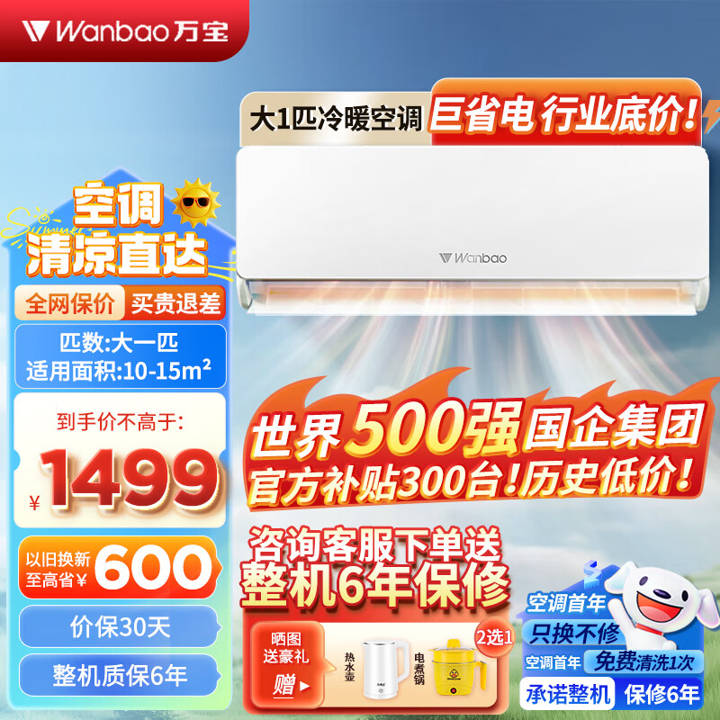 万宝大1匹空调挂机 新三级能效变频家用卧室节能空调快速冷暖 KFR-26GW/BPWB1-N3 含基础安装价格:1499.00元!