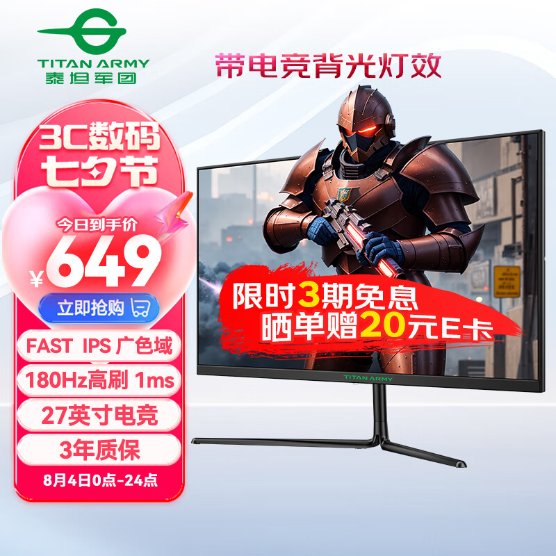 泰坦军团27英寸 180Hz高刷 1msGTG FAST IPS广色域 多情景模式电竞游戏高清电脑显示器 兼容144hz P27A2GC价格:899.00元!