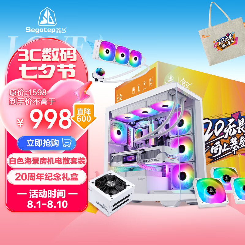 鑫谷(segotep)20周年纪念版礼盒(无界1白机箱+GM850W白电源+风刃360白水冷+3把冰霜ARGB反向风扇)价格:998.00元!
