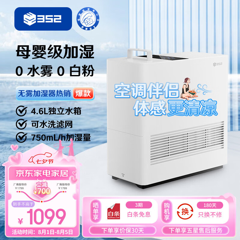 352无雾加湿器除菌大容量家用房间卧室办公室婴儿孕妇蒸发式大面积H80 空调房加湿器价格:1299.00元!