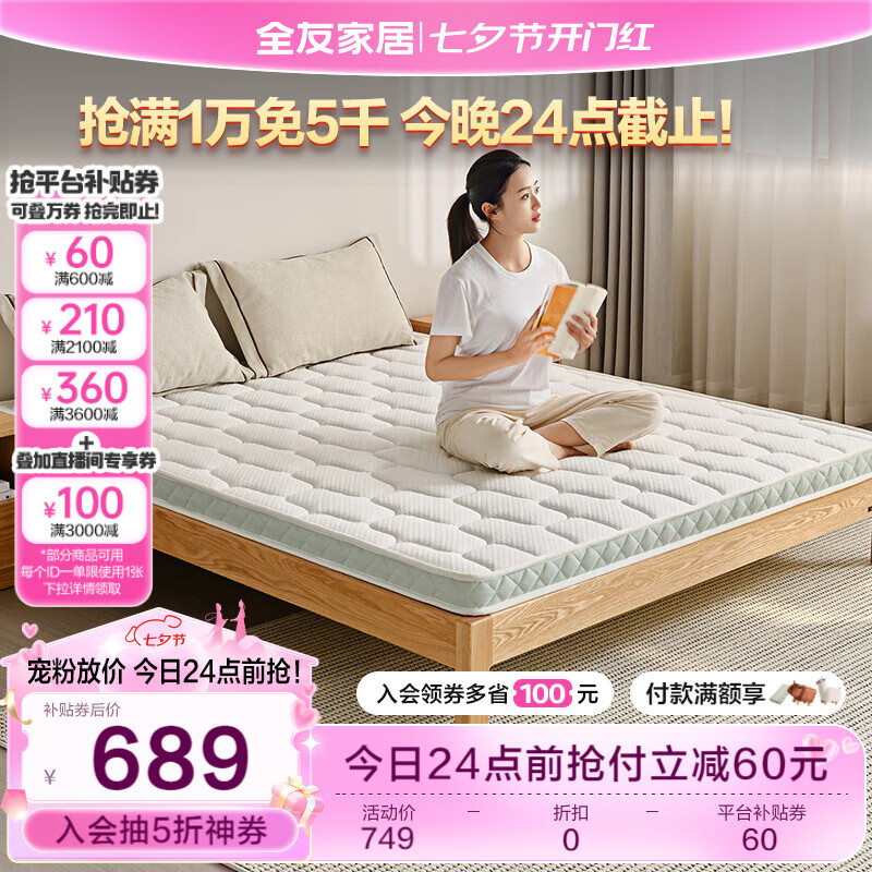 全友家居 3D护脊天然椰棕床垫1.8x2米双人家用席梦思床垫子117017价格:749.00元!