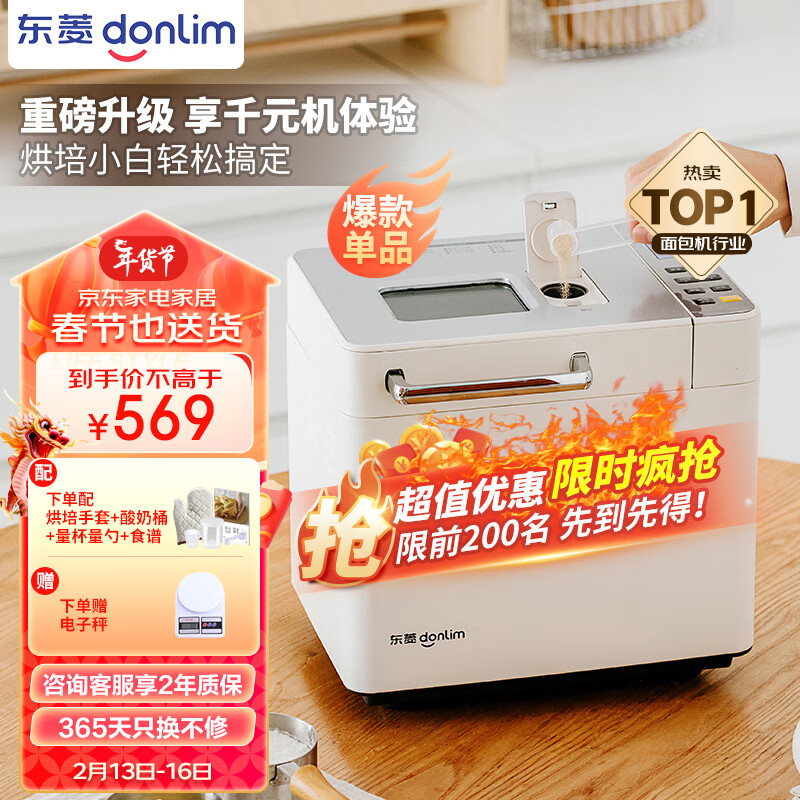 东菱(Donlim)全新升级面包机 全自动 和面机 家用 揉面机 可预约智能双撒 高成功率面包机DL-4705(白色)价格:520.00元!