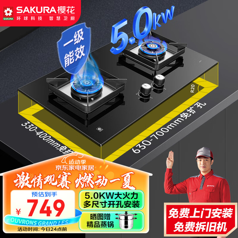 樱花(SAKURA)燃气灶天然气大火力家用双灶一级能效5.0kW大火力大面板宽边底壳多尺寸免扩孔可安装JGC01天然气价格:849.00元!