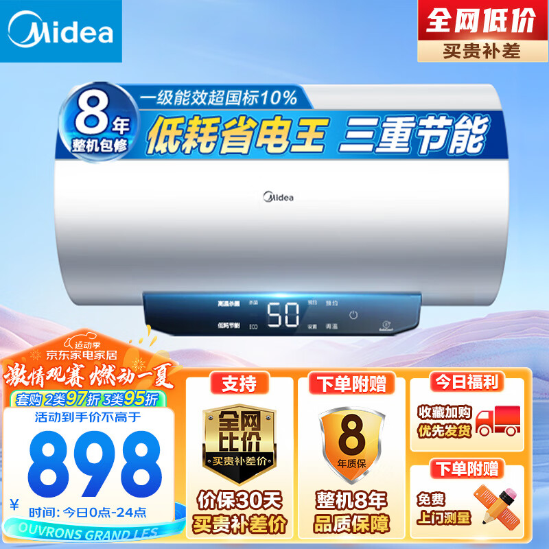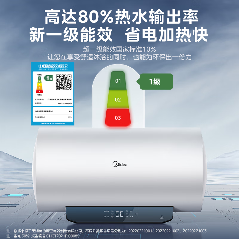美的(Midea)【低耗省电王】60升电热水器2500W速热长效免换镁棒整机8年质保一级能效节能大水量F6022-JM1(HE)价格:898.00元!