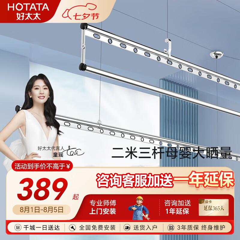 好太太(Hotata)晾衣架阳台三杆手摇晾衣杆升降手动室内室外 晒衣架家用晒衣架 D-1117 2.0米银色三杆+免费安装价格:489.00元!
