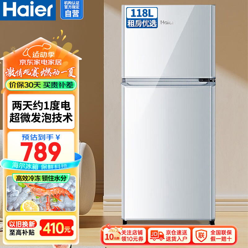 海尔(Haier)冰箱118升二门双开门迷你小冰箱节能省电家用超薄租房宿舍冷藏冷冻家电小型直冷电冰箱BCD-118TMPA价格:789.00元!
