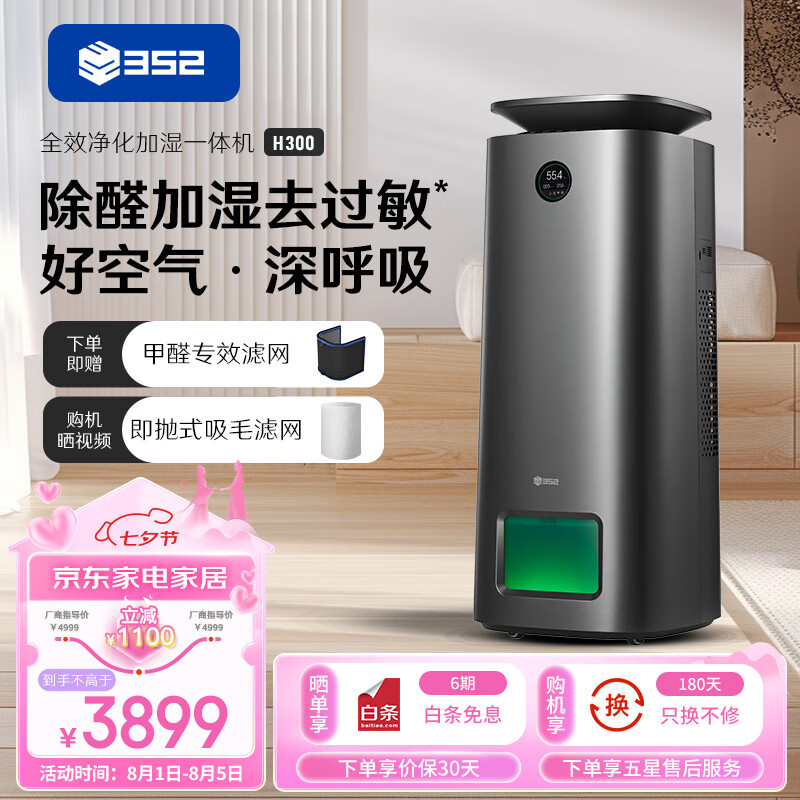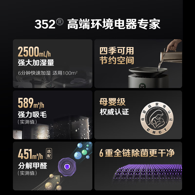 352加湿器空气净化器 家用室内除甲醛除菌病毒吸猫毛 落地式2500ml极速无雾加湿净化一体机 H300价格:4099.00元!
