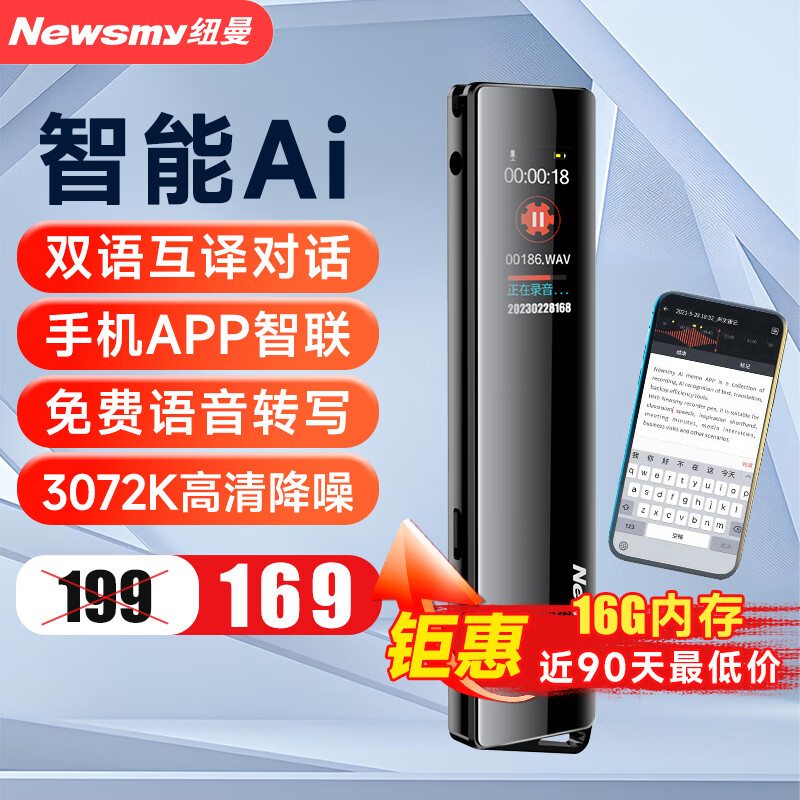 纽曼智能录音笔 V03 Pro 16G 蓝牙版 会议录音转文字 同声翻译 声文速记 专业级降噪 一键录音 哑黑价格:199.00元!