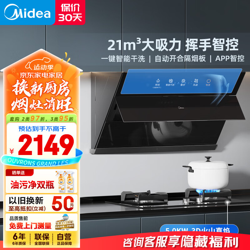 美的(Midea)抽油烟机燃气灶套装 侧吸式家用脱排烟机灶具套装 21风量自智能挥手动清洗J39+Q230A天然气价格:2149.00元!