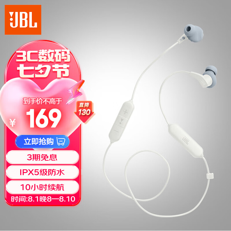 JBL Run BT2 颈挂式运动无线蓝牙耳机入耳式跑步登山骑行磁吸防丢游戏音乐耳机 白色价格:269.00元!