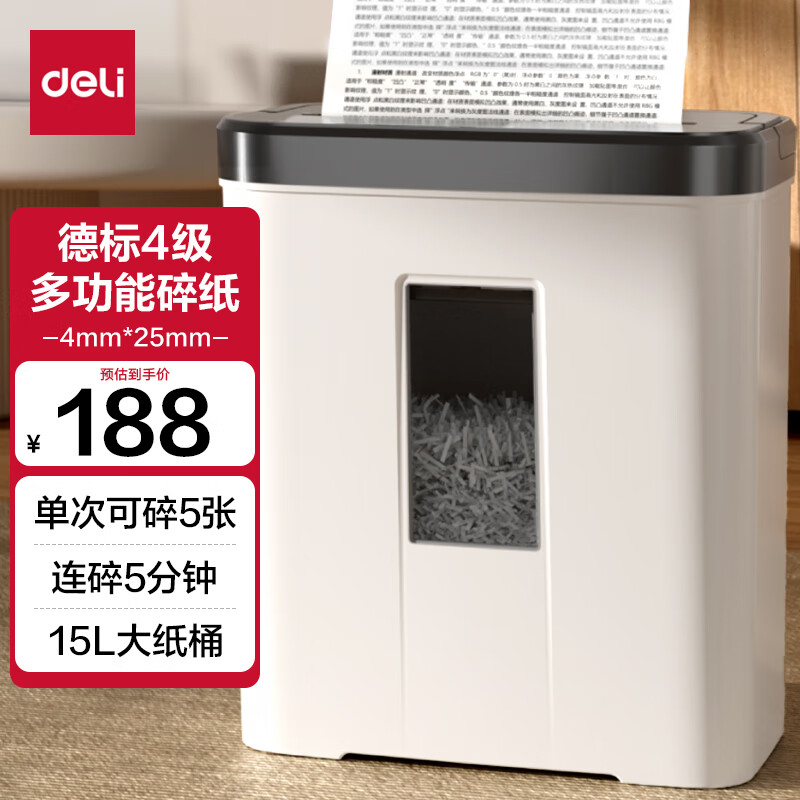 得力4级保密办公碎纸机家用大型商务纸张粉碎机小巧低噪多功能碎纸 单次5张连碎5分钟15L180天只换不修价格:218.00元!