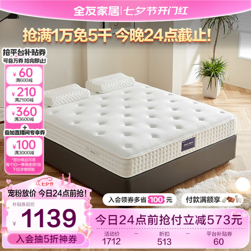 全友家居 独立袋装弹簧床垫1.8x2米卧室天然进口乳胶零压床垫子117007价格:1712.86元!