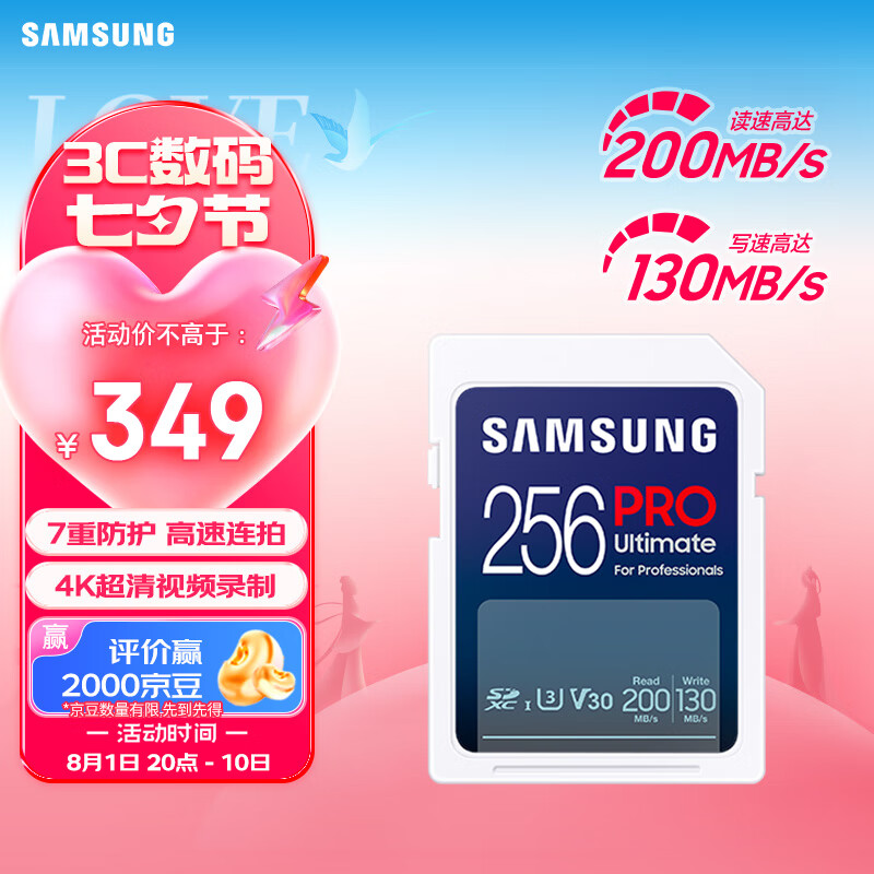 三星(SAMSUNG)256GB SD存储卡 超高速PRO深蓝卡 U3 V30 专业级SD相机卡支持4K高速连拍 读速200MB/s写速130MB/s价格:349.00元!